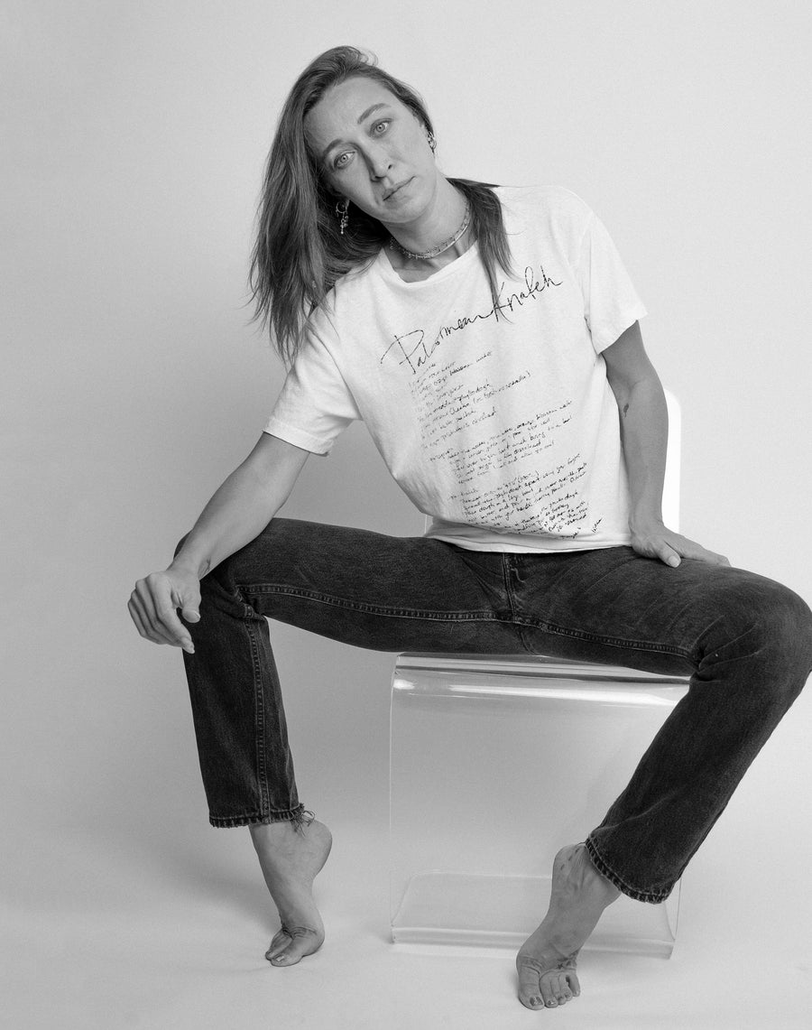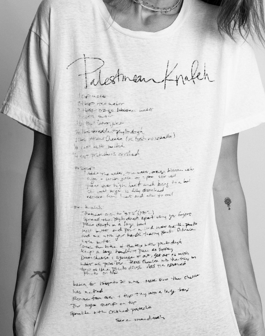 Our Knafeh T-Shirt displays Alana Hadid’s handwritten recipe, passed down from her family. The tee is reverse printed on recycled cotton, which gives the recipe image a delicately faded feel. The neck labels are designed with shirt sizes handstamped next to the Palestinian flag.